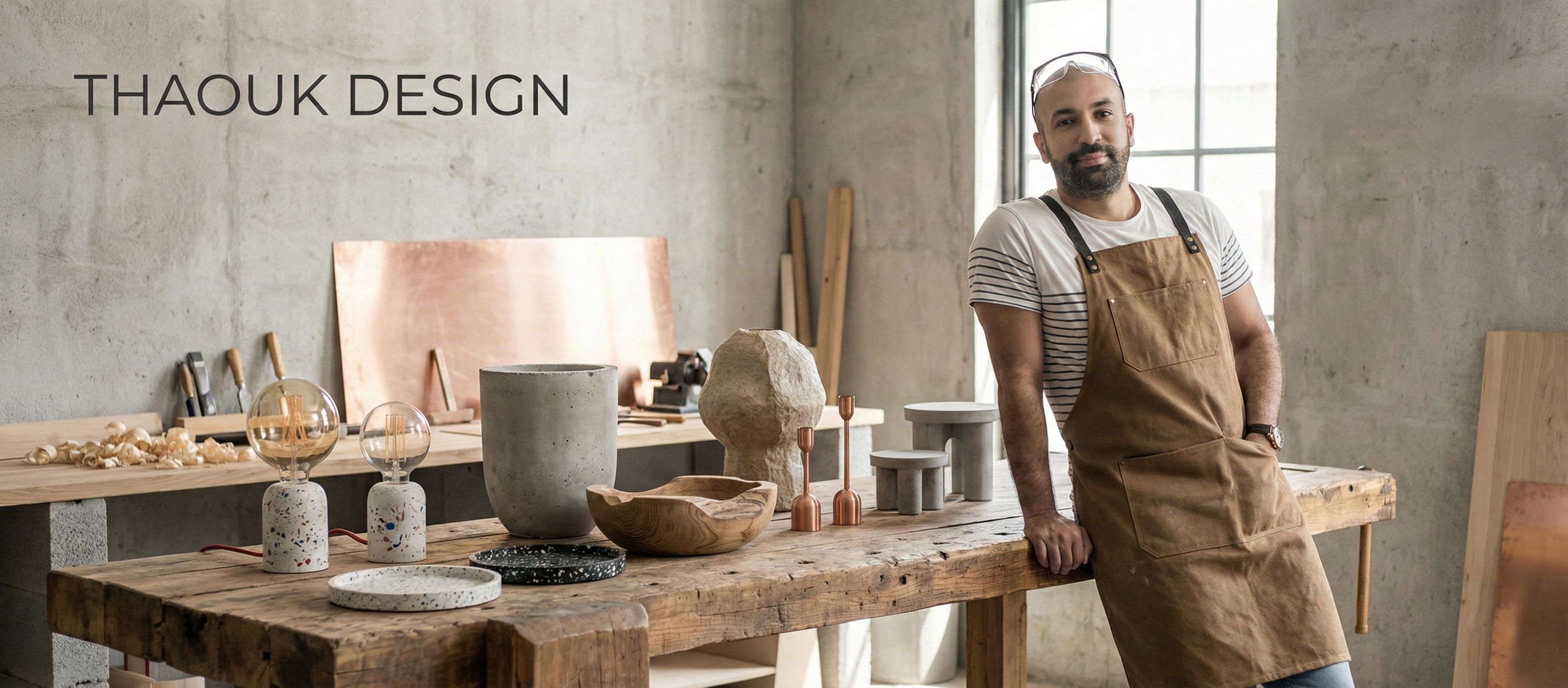 Thaouk, qui signifie goût / esthétique en arabe, est né de cette quête : donner du sens à la forme, révéler la beauté de l’imparfait, laisser la matière parler. Béton, bois, métal, cuir — chaque matériau est choisi pour sa vérité, sa mémoire, sa force brute.